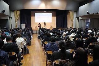 本日、多目的ホールにて今年度最後の学校説明会を行いました。説明会に先立って歓迎の意を込めてオープニングセレモニーを行いました。今回は、軽音フォーク部と能楽部です。