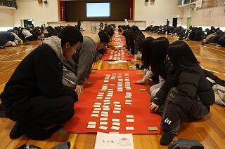 本日、午後から体育館にて、2年生が集まり「百人一首大会」が行われました。毎年行われている本校生徒自治会主催の伝統行事です。 2年生は2回め、1年生の時に実施した経験から「覚えていないと面白くない」と、各クラスHR委員が先導して2階廊下や教室内のあちらこちらに百人一首の歌を貼り出しました。 学年所属の先生が交代で読み札を詠まれていました。生徒達は真剣勝負。1首ごとに歓声が上がります。予習の...