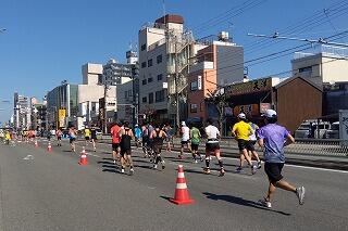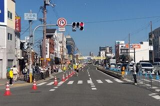 私は今年もスタートから35㎞以降の大池橋交差点から今里交差点までの区間を担当しました。区間内のコース審判員に声を掛けて回りながら、警察や警備会社、ボランティアやメディカルの方々と連絡をとり、ランナーが安心して安全に走れる環境を維持する役割です。また、交通規制などで不便な思いを強いられている地域住民の方々にもご協力をいただきました。有難うございます。