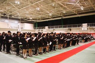 本日、久しぶりに3年生が登校し、体育館で明日の卒業式の予行を行いました。式の簡単なリハーサルを行い、はじめに歌う校歌の1番と3番、最後に皆で歌う「卒業の歌」の練習をしました。