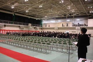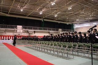 9時55分、総務部長の西口先生の司会進行で、大きな拍手と吹奏楽部の迫力ある生演奏のなか、28期生235名並びに共生推進教室2名の計237名の3年生が入場してきました。