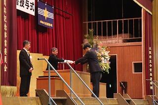 続いて、自彊会会長新居様、PTA会長船山様からご祝辞をいただきました。有難うございます。そしてご来賓の紹介、祝電披露のあと、大阪府教育委員会表彰と全国総合学科高等学校卒業生成績優秀者表彰を、それぞれ4組山下さん、5組嶋谷さんに行いました。おめでとうございます。さらに、3年間の皆勤者の紹介が梁先生からありました。