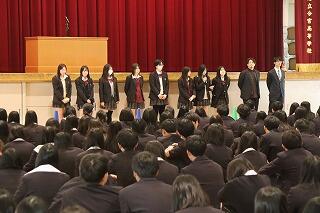 教頭先生による閉式の辞の後、続いて部活動総代の2人(軽音フォーク部、女子バレーボール部)から来年度の部活動「志―スローガン」の発表がありました。「共に青く駆けていけ」―2人はそのことばに込められた思いや意味を清々溌溂と伝えていました。