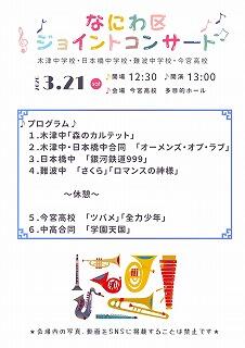 本日午後1時から多目的ホールにて木津中学校、日本橋中学校、難波中学校の吹奏楽部と一緒になって、「なにわ区ジョイントコンサート」が開催されました。三中学の先生方や保護者の皆さまをはじめ、本校吹奏楽部の保護者の方々もたくさんご来校くださり有難うございました。私も楽しみにしていましたが、急用が入り駆け付けた時にはちょうど終わったところでした。残念ですが、ホールを出てこられた保護者の笑顔や、演奏を終えたばかりの生徒の皆さんの清爽な姿を見て、とてもいいコンサートになったと確信しました。