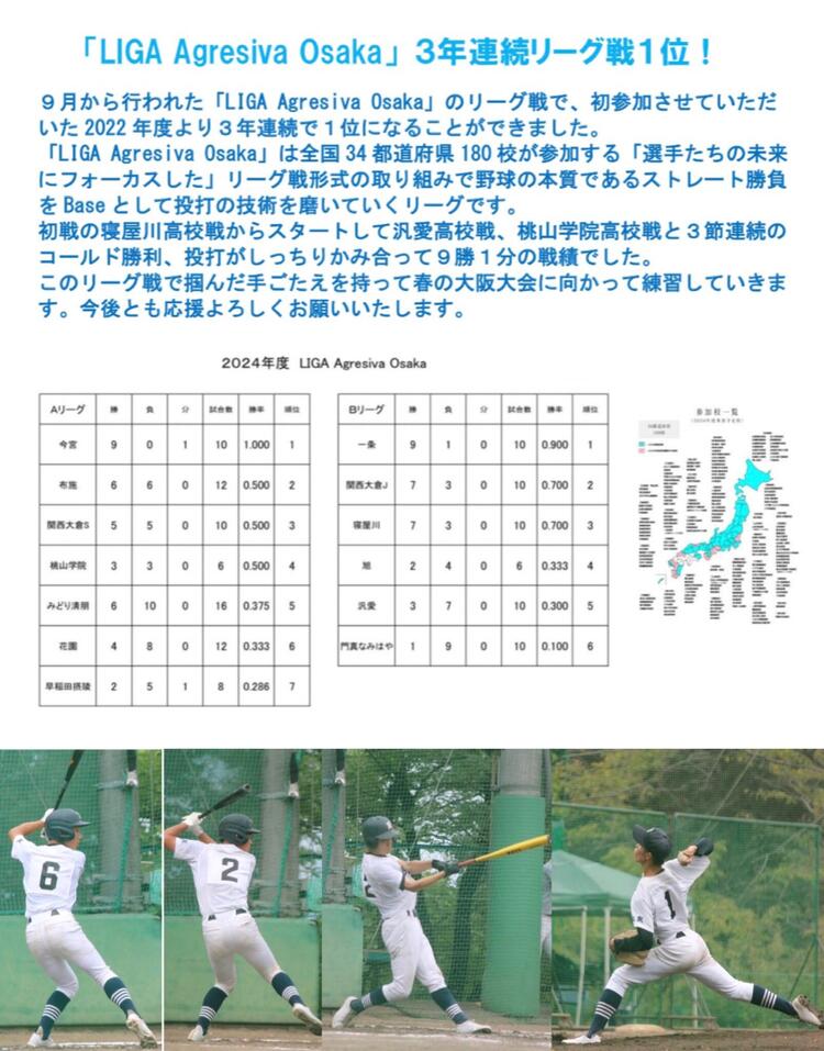 2022年度より参加しているLigaAgresivaOsakaで3年連続で1位になることができました。初戦の寝屋川高校戦からスタートして汎愛高校戦、桃山学院高校戦と3節連続のコールド勝利、投打がしっかりかみ合って9勝1分の戦績でした。