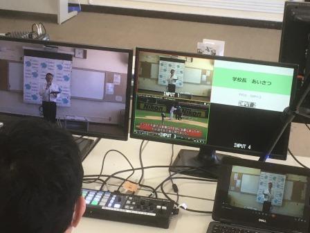 今日はこの3月に、本校から転勤された先生がたへの離任式です。 まずは校長先生からのあいさつ。 ちなみに部屋の後ろはこんな感じで、スタジオができています。 そして各教室のプロジェクタには先生方の映像が流れます。 ちなみに、今日来ることができない先生は、オンラインで転勤先の学校から挨拶をしてもらっています。 もちろん来られた先生方にも一人ひとりあいさつをいただきました。 転...