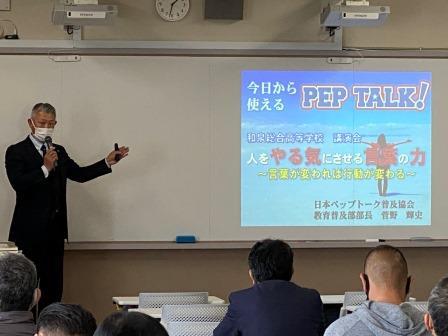 日本ペップトーク普及協会より教育普及部部長の菅野輝史先生を招いての教職員研修を行いました。 人をやる気にさせる言葉の力~言葉が変われば行動が変わる~ と題して、言葉の力で生徒を育てるための取り組み事例の紹介などでした。 まずは校長先生からのあいさつ。 そして、いよいよ本題です。 今回は全日制・定時制の共催で開催しました。 貴重なお話、ありがとうございました!