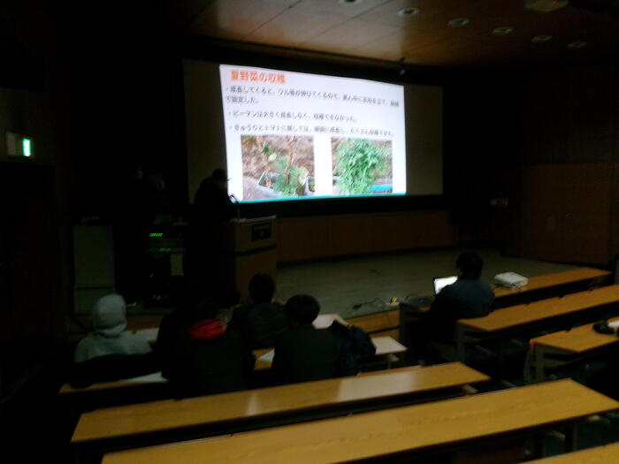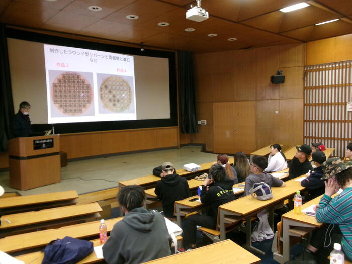本日は3年生最後の授業日!ということで、、、1年間の集大成である 「発表会」を視聴覚教室にて執り行いました。6グループおのおのが 発表を行い、作品の展示も行われました。工業以外の生徒や先生も 見学に来られ、意見や質問など出していただきました。この授業に 携わった方々、1年間おつかれさまでした! ↑作品展示の様子
