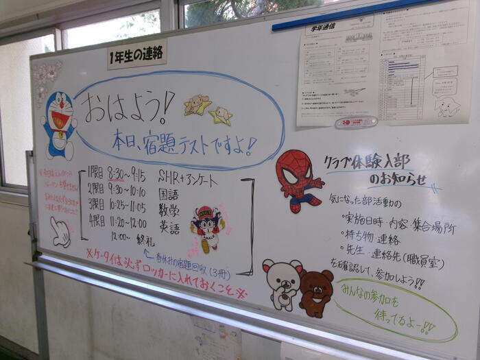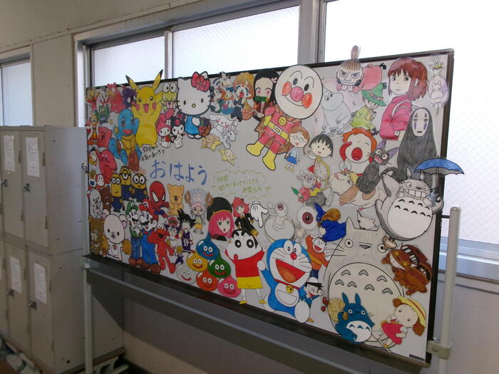 本日いよいよ、3年生のラスト授業となりました!ホワイトボード には3年間使われたキャラクターが大集合。。。こんなにあったん ですね!ライフワーク化していた担当の城野先生、お疲れ様でした!!