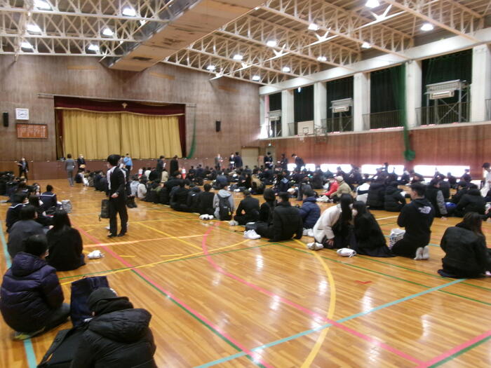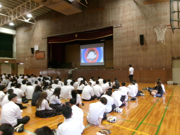 いよいよ夏休み明け、初日の授業がスタートしました!! 体育館での全校集会の様子です。 ①校長先生のおはなし②生徒支援より新ルール③保健室レイアウト変更 に続き、最後は万博で演奏した軽音楽部の動画が紹介されました!!