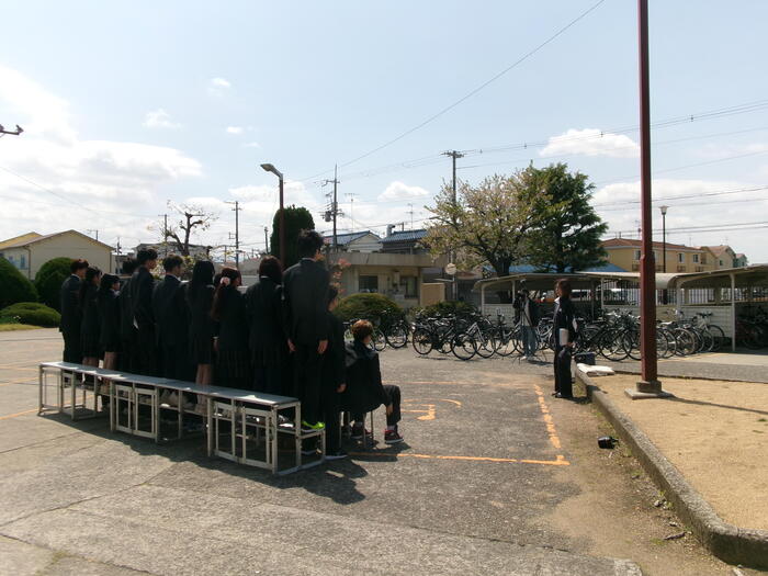 昨日の話ですが、日曜の「大阪・関西万博」の試運転ということで自衛隊 の「ブルーインパルス」がテスト飛行を行いました。教頭先生の校内放送 の通り、和泉総合上空を6機の機体が一糸乱れぬV字編隊で駆け抜けました! 一目見ようと外に出られた先生方や生徒もおられたのでは!?筆者も歯科 検診の合間に運よく遭遇できました、感動しました。日曜も楽しみですね!