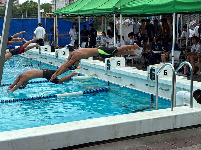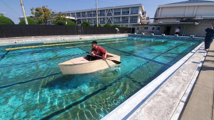 本日1時限目、「ものづくり探究」の授業で取り組んでいる「EVボート」 の水上テスト走行が行われました。プールのコースロープを一部取り外し まずは船内に浸水がないかチェックし、その後は喫水深さから浮力を計算 します。最後は電動推進器でクルージングテスト行いました! 7月のインテックス大阪(産業教育フェア)にて展示予定です。