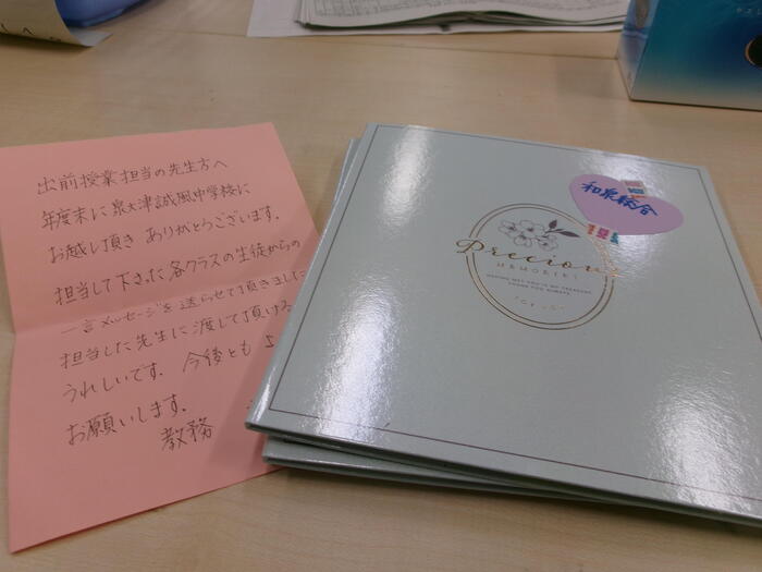 昨日のお話になりますが、12月に出前授業で訪問した泉大津市立誠風中学から お礼のアルバムをいただきました!さっそく担当者に渡してあげたいと思います。 協力してくださった先生、ありがとうございました!!