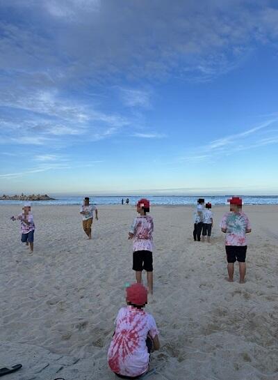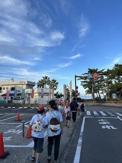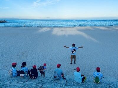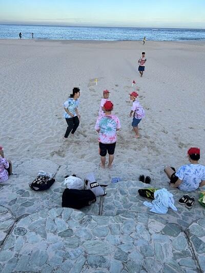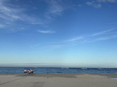 朝食前に気持ち良い青空の下、砂浜の景色を楽しみ、ビー