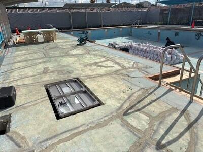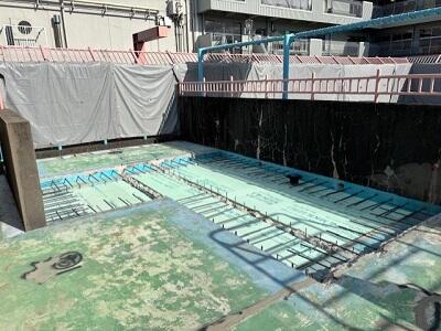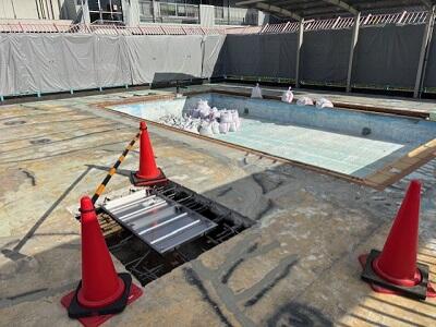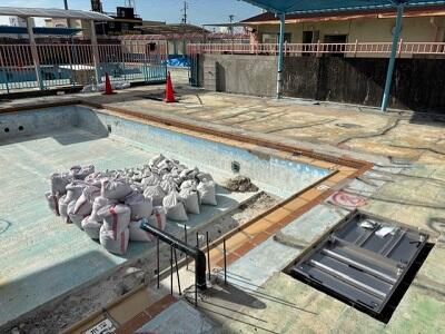 不要なコンクリート壁などを撤去し、プールサイドに機材