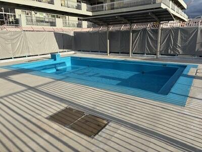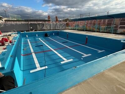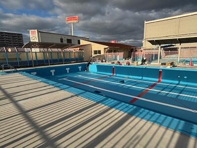プールサイドや更衣室の床面に薄くコンクリートをひいて