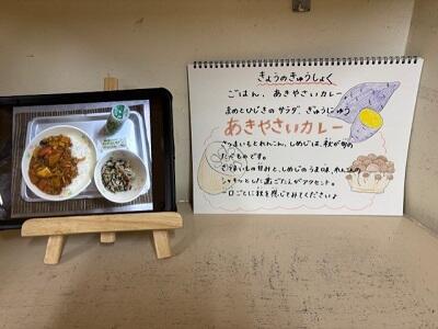 本日の給食は、秋野菜のカレー、豆とひじきのサラダ、のむ
