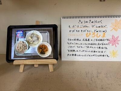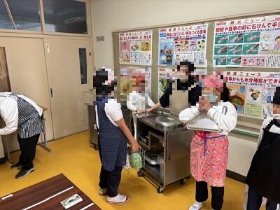 みなさんが協力して給食室から教室に食器や食缶を運んで