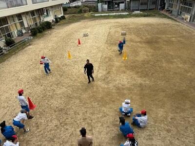 中庭で、体育の授業「ポートボール」に取り組んでいます。