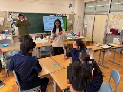 んが来校しました。歌やダンスを披露しあったり、混合チ