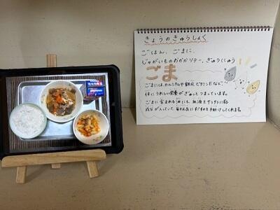 本日の給食は、ごはん、ごま煮、じゃがいものおかかソテー