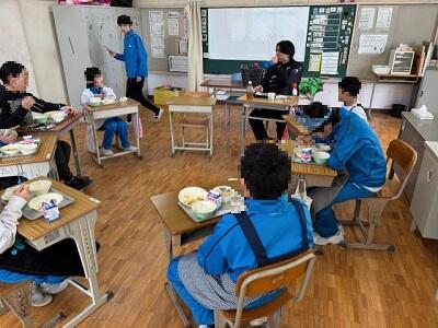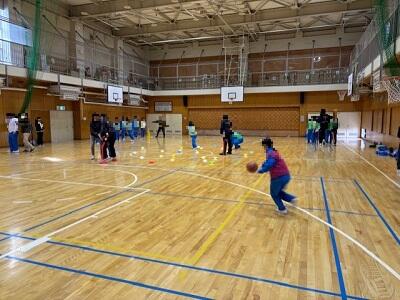 体育館でボールを使ったゲームを行い、給食時間とその後