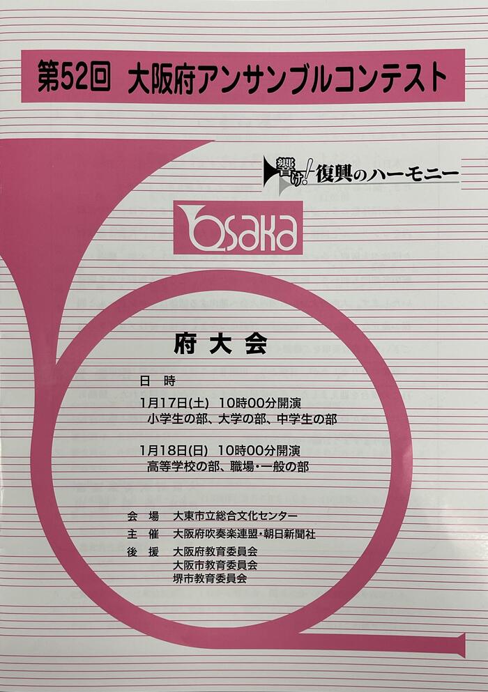 今日、八尾文化会館「プリズムホール」で開催された「第52回大阪府アンサンブルコンテスト《南地区高等学校の部》」に和泉高校からサクソフォーン四重奏(2年)が参加。長生淳作曲『彗星 トルヴェールの《惑星》より サクソフォン四重奏のための』を演奏して、無事、《金賞》を受賞し、《南地区代表》に推薦していただきました。《大阪府大会》は1/18(日)に大東市立総合文化センター「サーティホール」で開催されます。...