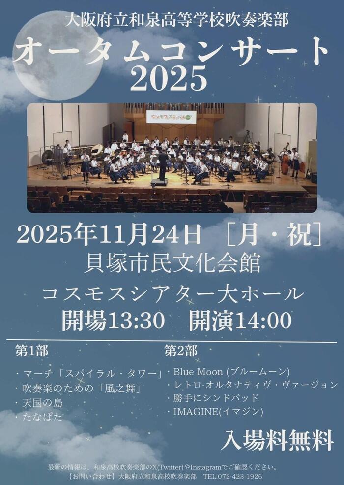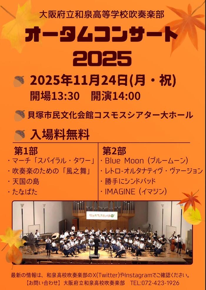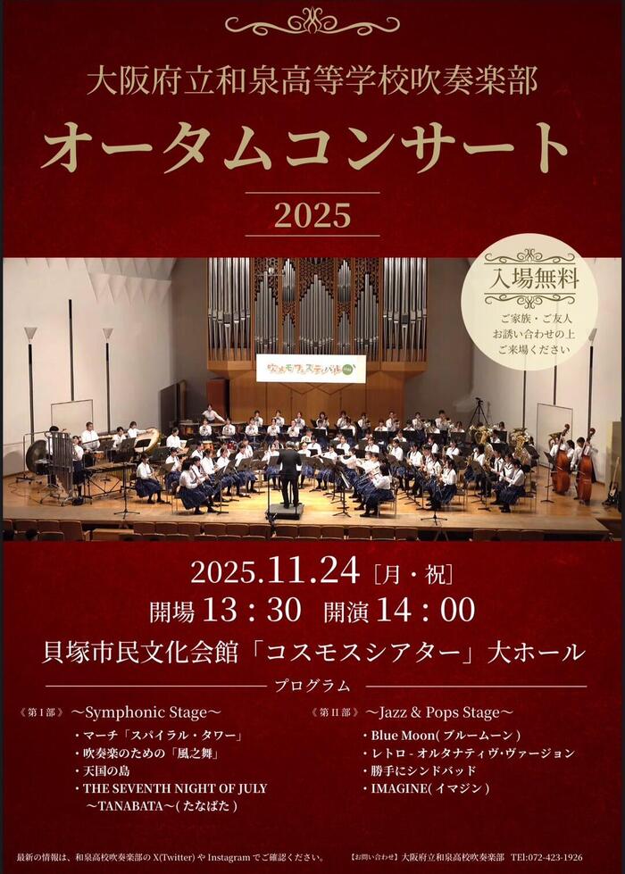和泉高校吹奏楽部は、11月24日(月・祝)に貝塚市のコスモスシアター大ホールで「オータムコンサート2025」を開催いたします。