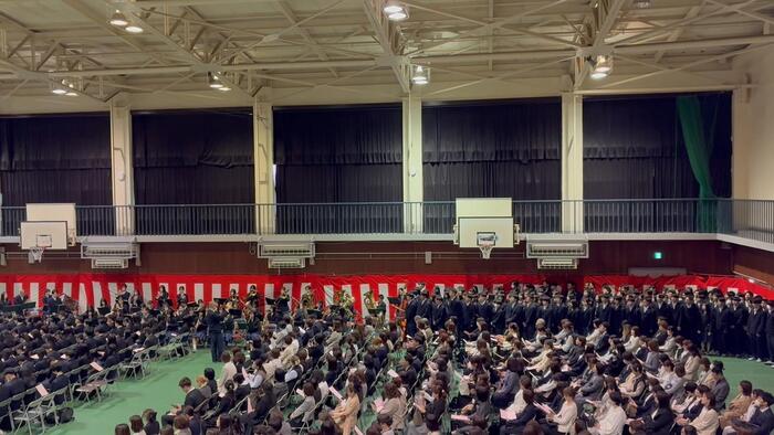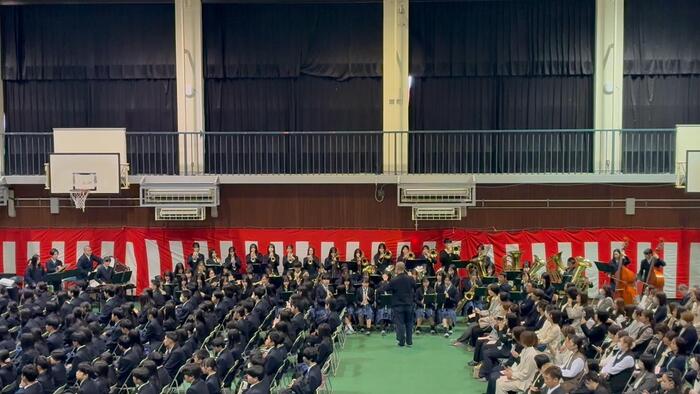 吹奏楽部は、「校歌紹介」では100名を越える音楽選択生徒の合唱と一緒に『大阪府立和泉高等学校校歌』を、「新入生退場」では退場の音楽として『あつまれ おもちゃのマルチャ!』と演奏しました。