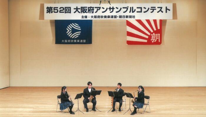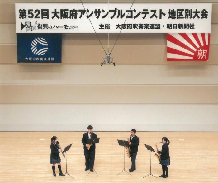 今日、大東市立総合文化センター「サーティホール」で開催された「第52回大阪府アンサンブルコンテスト《大阪府大会》高等学校の部」に和泉高校からサクソフォーン四重奏(2年)が南地区代表として参加。長生淳作曲『彗星 トルヴェールの《惑星》より サクソフォン四重奏のための』を演奏して、《銅賞》を受賞しました。