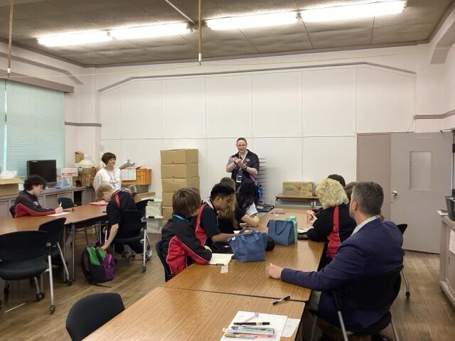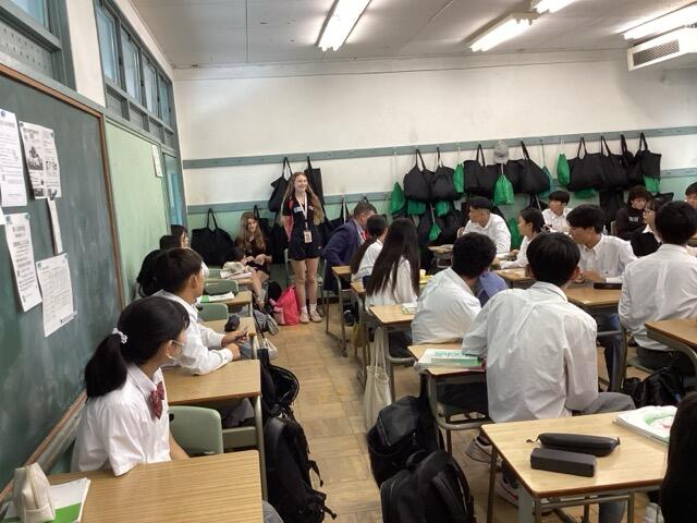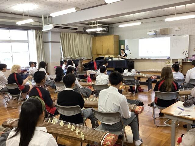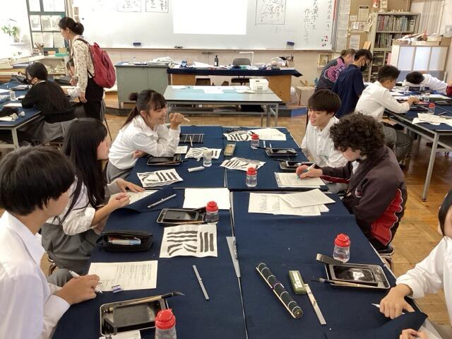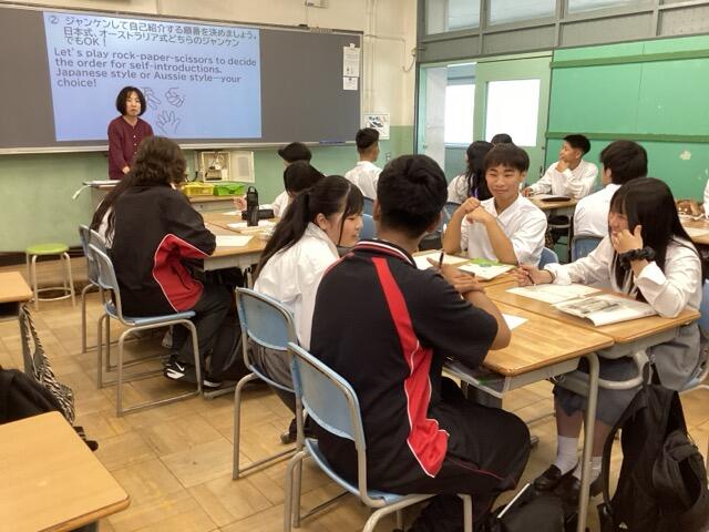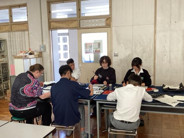 本校は泉大津市立中学校とともに、オーストラリアのノースジローンセカンダリースクール(ビクトリア州)と姉妹校提携をしています。9月末から来日している生徒のみなさんと引率の先生が本日、泉大津高校に来られました。朝、ホームステイ先のご家族に送って来ていただき、まず、会議室でご挨拶しました。私は下調べしておいた、たどたどしい英語で挨拶し、みなさんが自己紹介をしてくれました。その後、本校の1,2年生の授業(英語、音楽、書道)に入っていただき、本校生徒とともに授業を受けてもらいました。本校生も授業の進行を何とか英語で伝えようと、一生懸命頑張っていました。