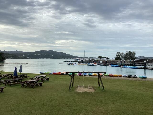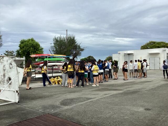 ホテルのすぐ近くの海辺での体験です。はじめに「はいさいおじさん」の歌に合わせて準備体操をして始まりました。