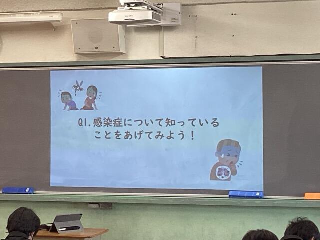 今日のテーマは感染症。新型コロナウィルス感染症が世の中を大きく変えたことも記憶に新しいところです。感染症とは?新興感染症、再興感染症の具体例を学びます。そして感染予防の三原則(感染源対策、感染経路対策、感受性者対策)を確認しました。適宜ペアワークを取り入れて、緊張とリラックスのあるメリハリのある授業でした。