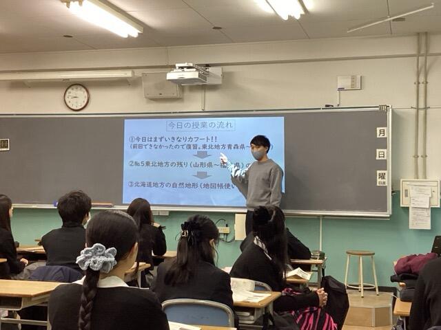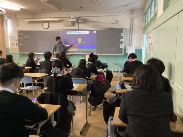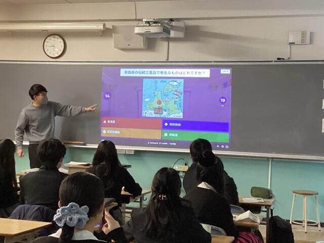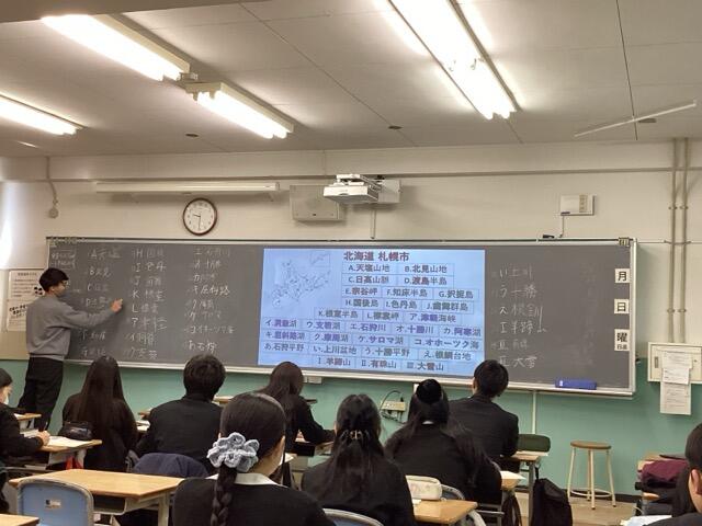 3年生の選択科目です。伺ったのは日本の地理の勉強でした。はじめに授業の目標を示し、クイズ形式でこれまでの復習をしました。授業から少し時間が経っていましたが、担当の教員の予想より正解が多かったようです。その後はスライドを中心に授業が進みました。スライドの写真や文字が見やすく、見る側からすると、とても興味をひかれるものでした。また発問を適宜取り入れ、一人1問ずつ黒板に答えを記入しに行くなど、自分で考え、体も動かすアクティブな授業でした。授業が終わって数人の生徒にインタビューすると、「写真がきれいなので、行ってみたくなる。」、「先生がコミュニケーションを取ってくれるので、わからないことも質問しやすく、質問すると自分の力になり、テストでも点数になります。」と返ってきました。