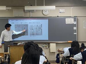 本校の先生方は、みんなの学習力が向上するようにわかりやすくて楽しい授業をめざし、色んな工夫をされています。今日は「教科書を書いている人になってみよう!」というテーマで「鎌倉幕府ができたのは何年なのか」を考えていく日本史探究の授業です。当時の資料を読み取るのは難しいので、「スクールAI」で源頼朝と会話しながら考えていきます。わからないことをAI源頼朝さんに聞き、グループで情報を集めていくことで、一人で考えるより広がり、深堀りすることができます。家庭学習でも使ってみましょう。
