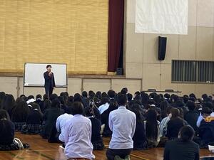3年生のみなさん、貝塚高校に登校する日はあと50日となりました。卒業式を迎えてしまえば、授業やテストを受けたくても受けられなくなります。先生たちもみなさんに学んで欲しいことがあっても伝えられなくなります。今日は、オレンジCAPO(児童虐待防止機構)の島田妙子先生にお越しいただき、お話しをしてもらいました。島田先生には11年前から毎年講演をお願いしていますが、それは、社会に出て、色んな人と出会い生きていくみなさんにどうしても伝えておきたい事だからです。島田先生ご自身が虐待を受けていた6年間、感情を失くし、誰にも本当の気持ちを告げない日々を送っていた時、本気で島田さんを守り、親と対峙してくれた担任のマッハ先生によって、事実を話せたということを語ってくださいました。また、喜怒哀楽の「怒」について、FF行動(Fight or Flight)を教えてくださいました。カッとなった時、アドレナリンを消し去るまで、行動を決めないこと。またそれは、練習して身につけていこうということでした。島田先生は「みんなよく聞いてくれていました。きっと心に留めて置いてくれてると思います。今でなくても思い返してくれればいいです。」とおっしゃっていました。今日の講演は生徒のみならず、教職員も自分事として捉え、一緒に学ばせてもらいました。ありがとうございました。