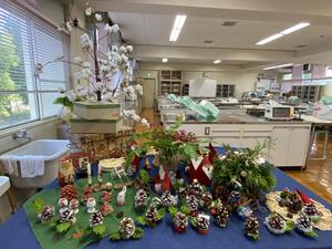 先日、食パック担当の先生から、「調理室に来てみてください、すごいですから!」とお誘いがありました。「凄いとは⁉」と少し不安になりながら入り口を開けると、ヨーロッパの街角を思い出させるようなオブジェが飾られ、いつもの調理室はクリスマス!生徒たちに気づかれない間に、セッティングされたとのことでした。さらに窓や説明用ホワイトボードには天使が羽ばたいていて、こんな素敵なプレゼントを生徒や先生たちにも与えられる学校でありたいなと穏やかな気持ちにさせてくださいました。本校の調理室は、授業者の細かい動きが見えるよう、天井に鏡があり、プロジェクターも完備しています。さて、この日の実習メニューはご覧の通り、クラブサンド・野菜スープ・シュークリーム。さすが3年生の調理は出来栄えも抜群です。
