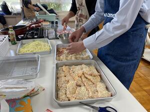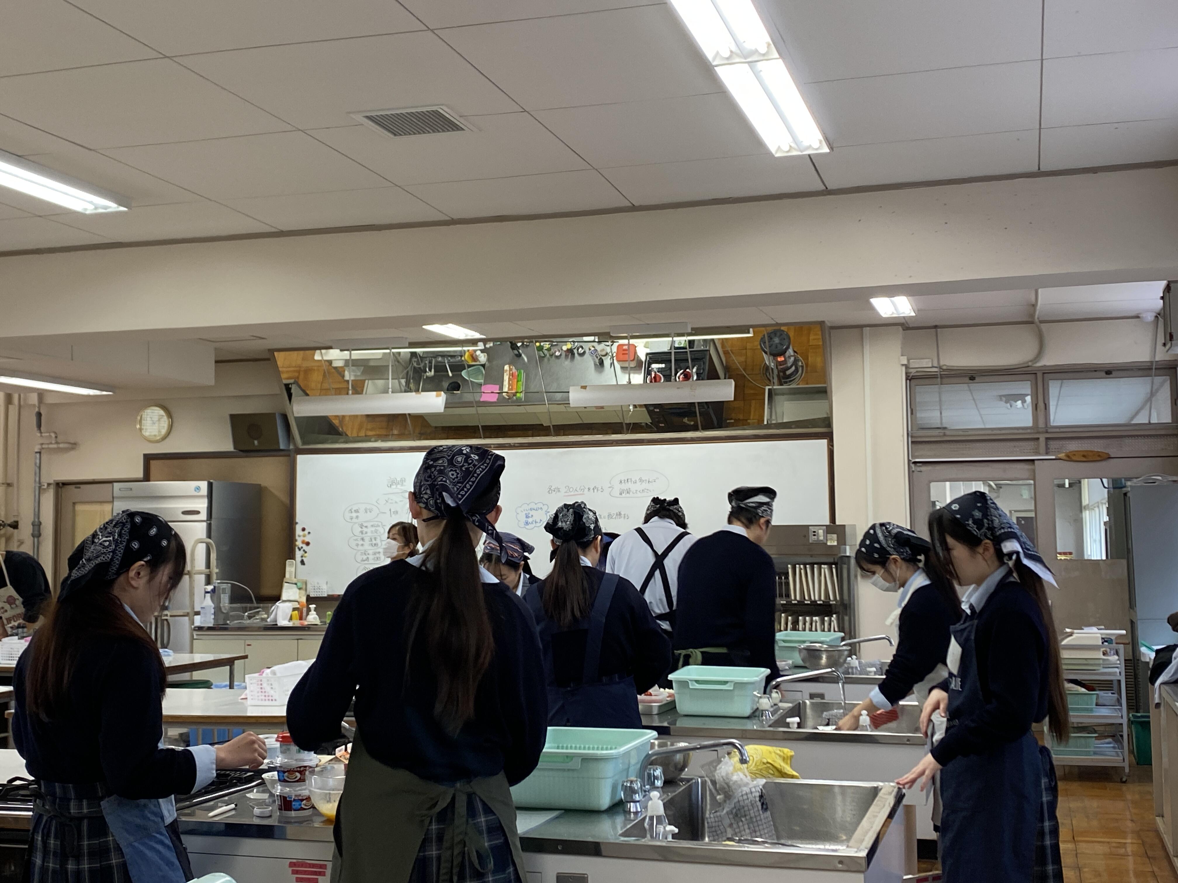 聞いてみると、各班メニューが決まっていて、全ての班を合わせると、コース料理になっているらしく、しかも20人分の大量調理だということです。メニューも自分たちで考えを出し合い、レシピを調べ、先生にチェックを受けて、今日に臨んでいます。