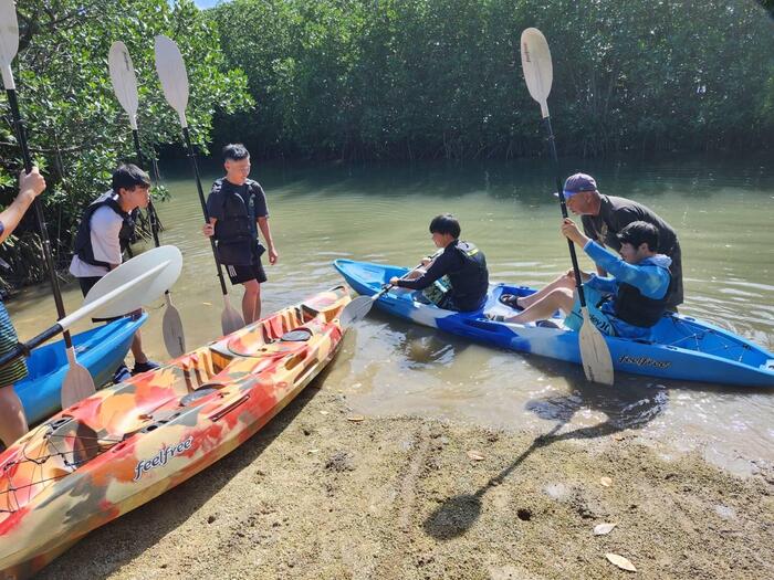 カヌー体験は午前~午後に行われました。午前は大雨が降っていたものの、午後にはそれまでの天候が嘘のように晴れてくれました。 青空の下、2人一組でカヌーに乗り縦横無尽に石垣島の綺麗な海を大移動。 体験を終えた生徒たちは疲れたと言いながらも顔は充実感で満ち溢れてました。よかったよかった。