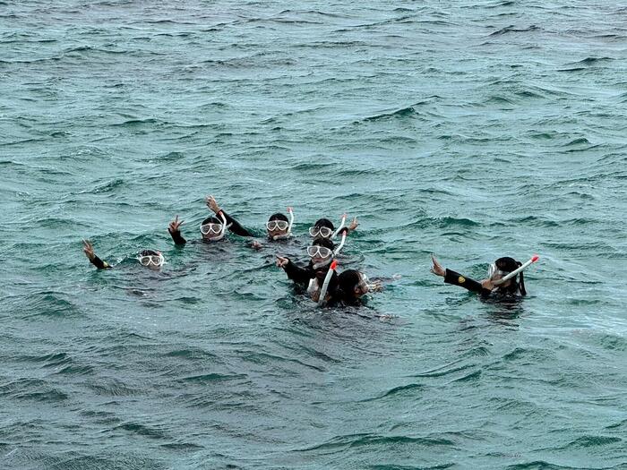 せっかく沖縄に行くなら少し怖いけど「ダイビング体験」がしてみたい! 船に乗り込みインストラクターの方から丁寧な説明を受け、生徒たちの表情も徐々に和らいでいきました。 ポイントに着くと次第に太陽も見えて最高のコンディションに。 ボンベを背負って、沖縄の海へダイブ!綺麗な海で色々な熱帯魚やサンゴ礁を見ることができました。 帰りの船では「やってよかった!」の言葉が多く聞けて先生も嬉しかったなぁ...