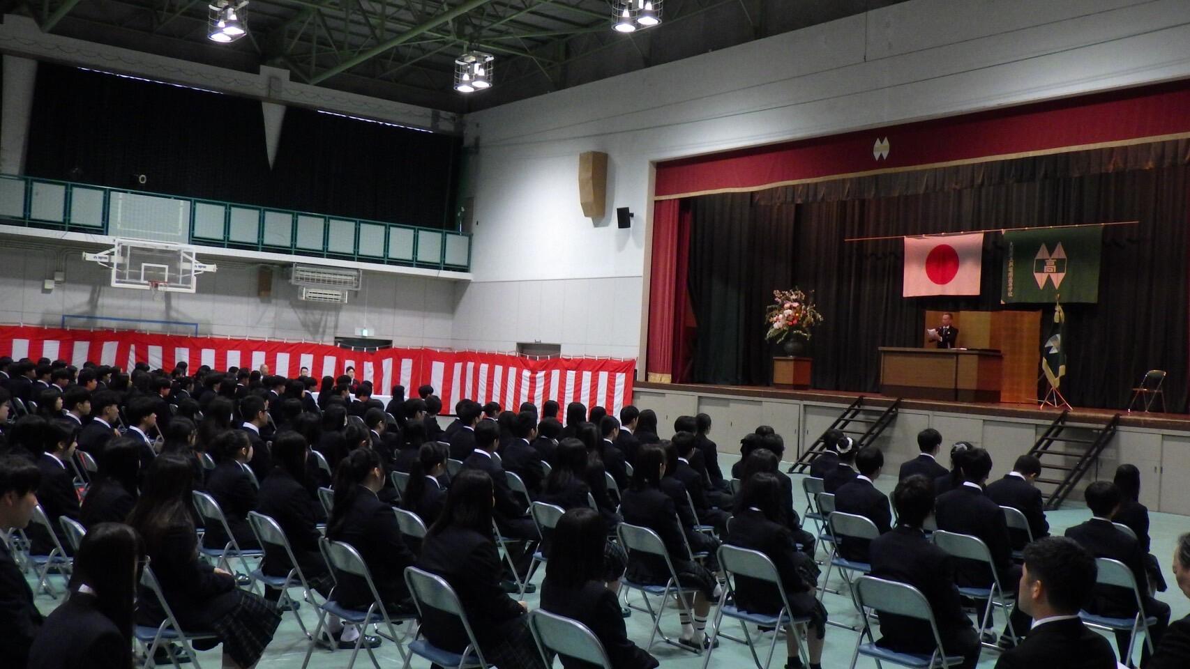 令和8年4月7日(火)本校体育館にて第53回入学式を挙行いたしました。公私ともご多用の中、ご来賓の皆様方、保護者の皆様方、関係者の皆様方のご臨席賜りましたこと心より御礼申し上げます。又、本日は、教職員一同子ども達の自己実現と社会に通ずる人格の形成という使命や責任を深く思い身の引き締まる瞬間でもあります。誰一人取り残さず、可能性を最大限に引出す教育活動を勧めて参ります。関係者の皆様方、貝塚南高等学校への期待とご支援の程よろしくお願いいたしす。