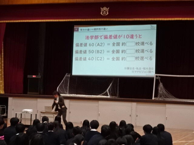 9月12日に実施しました「スタディサポート」実力診断テストの結果を自己分析するための開設を関係機関の方を講師としてお迎えし、1・2年生別々の講義をしていただきました。2年生は、「3年生'0'(ゼロ)学期」の準備として、生徒の皆さんはとても真剣な眼差しで分析方法を聞いていました。また、1年生は高校での学習を深めていくための「きっかけづくり」として、気を引き締めるような雰囲気が漂っていました。本校の放...