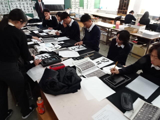 金岡高校では、3年生の選択科目にこれまで選択していなかった科目にチャレンジすることができます。今回は、芸術科目のなかでも他校では珍しい「書道」の授業紹介です。1・2年生で他の芸術選択をしていた生徒さんが初めて「書道」に挑みます。中学校では、国語の授業の中で「書写」をしましたが、高校の授業では「芸術」として書道を楽しんでもらっています。まずは、基本をしっかり学び、そこから個性を出すような授業内容になっています。普段は、ワイワイしていてもいざ作品制作になるととても集中していました!完成作品が楽しみですね!