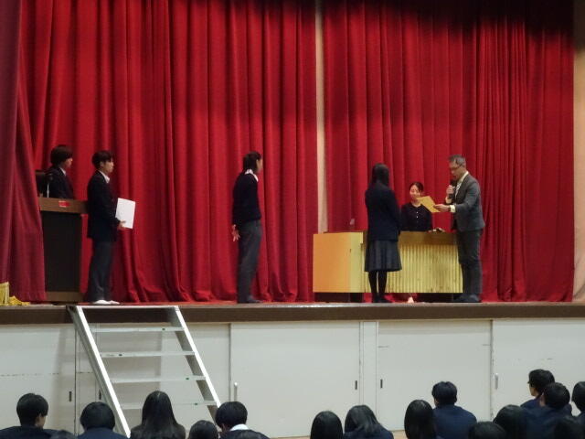和7年度も2学期を終え、残すは後数か月となりました。早いですね~!夏から秋にかけて、猛暑日続きだったので気づいたら真冬の寒さとなっていました。2学期の学習成果がそれぞれの通知表に記載されていますが、生徒の皆さんは頑張りが結果となっていますでしょうか。また、実力診断テストのゾーンももう一度確認して、冬休みの課題や自主学習の励みにしてくださいね。式の後半は、2学期に部活動などで活躍された生徒さんの表彰をしました。皆さん、受賞おめでとうございます!週末は、少し荒れ模様ですが、今夜はクリスマスと来週の今日は新年を迎えます。体調管理に配慮して、来年1月7日(木)の始業式で元気な姿で登校してきてくださいね。では、よいお年をお迎えください。