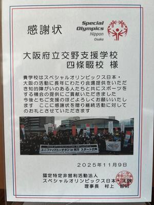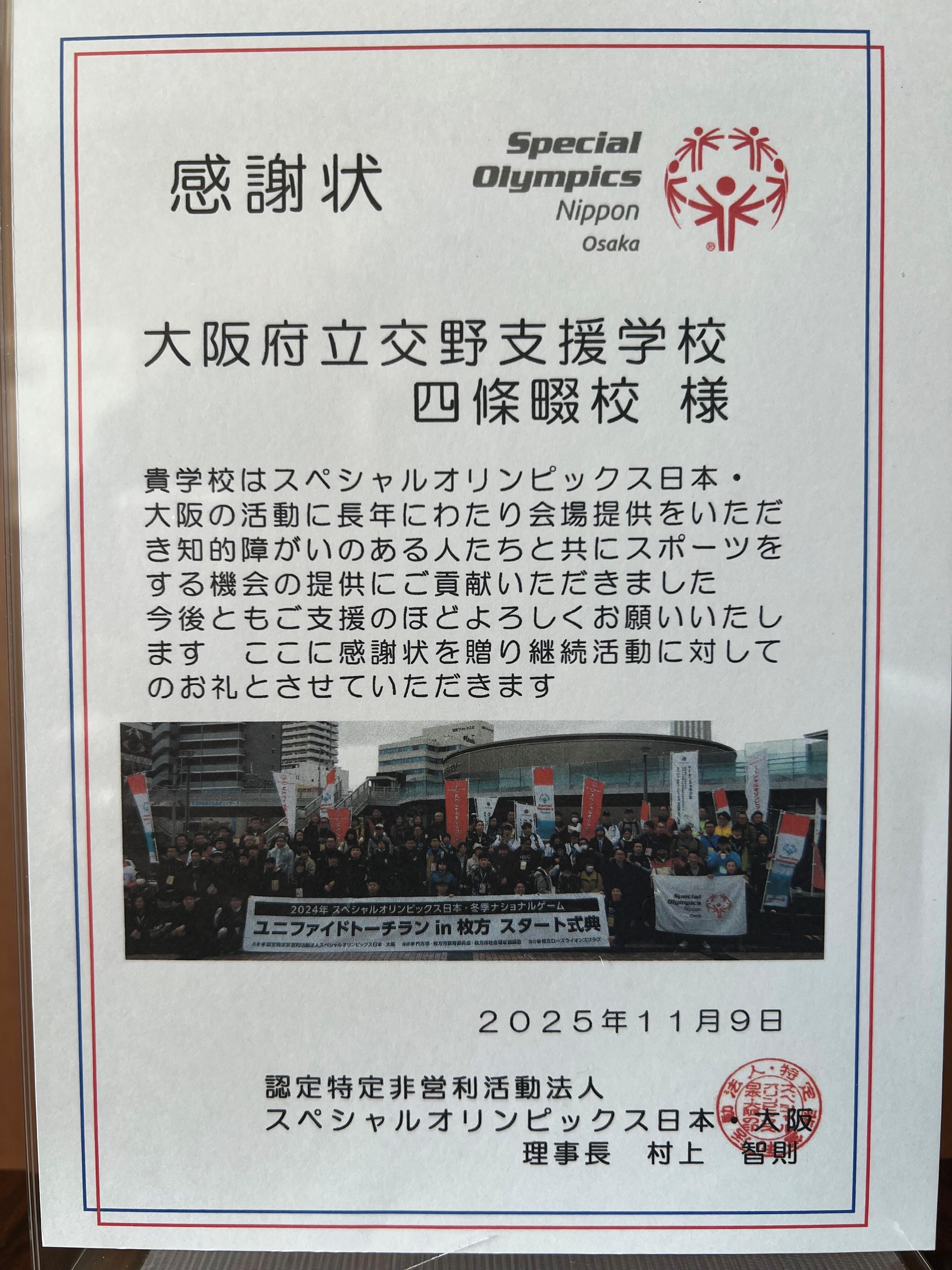 交野支援学校四條畷校も活動の場を提供させていただいており、この度、スペシャルオリンピックス日本・大阪の記念式典に際して感謝状が授与されました。(余談になりますが、式典記念品のトートバッグは、本校校門にも鎮座しているサンタの作者、谷口 智則さんのデザインです。)