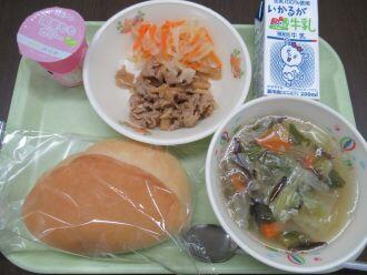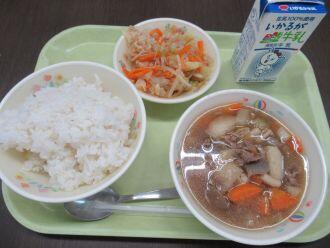 「ごはん いも煮 キャベツのおかか和え 牛乳」 山形県の献立として「いも煮」が登場しました。牛肉と里芋たっぷりのいも煮は牛肉のうま味とやわらかく煮込まれた里芋がよくあっていました。いも煮は山形県の名...