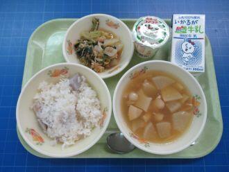 「さといもごはん かしわの煮物 白菜とツナのおひたし コアコアりんご 牛乳」 今日の給食は大阪府の郷土料理でした。かしわと大根と竹の子がたっぷり入ったかしわの煮物は優しいお味でとても美味しかったです...