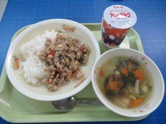 「ガパオライス チンゲン菜のスープ アシドミルク」 今日の給食は初メニュー!タイの献立でガパオライスが登場しました。ガパオライスとは、ナンプラーやオイスターソースを使って炒めた具材を、ご飯と一緒にお...