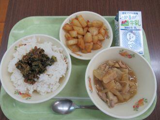 ごはん アドボ(鶏肉のさっぱり煮) フライドポテト(コンソメ)小松菜のふりかけ 牛乳