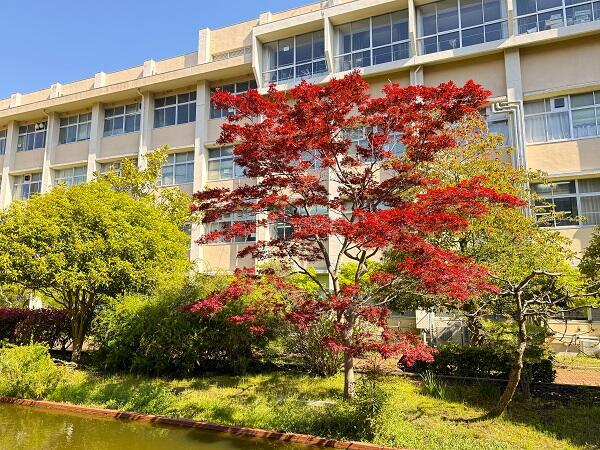 本校の中庭には池があり、池の周りなどで、生徒が昼食を食べています。